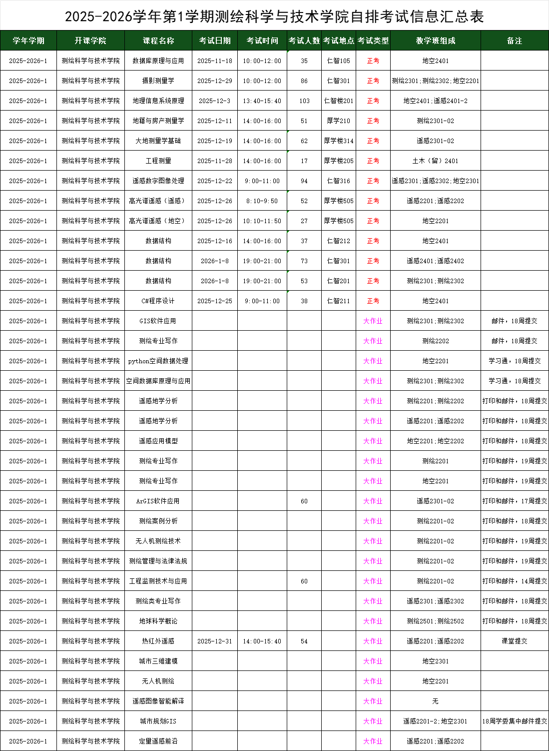 2025-2026学年第1学期测绘科学与技术学院自排考试信息汇总表